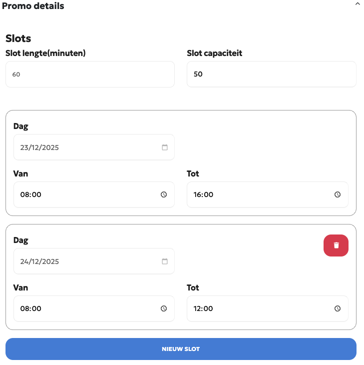 - Ophaaldag(en) en uren kan je hier instellen specifiek voor deze special, dit zijn dus de dagen dat de klant krijgt als keuze bij hun bestelling. Dit kan voorbij de eind datum zijn van de special en ook tijdens dagen dat ingesteld staan als vakantiedagen in onze vakantieplanner. Extra dagen voeg je toe door op "nieuw slot" te drukken