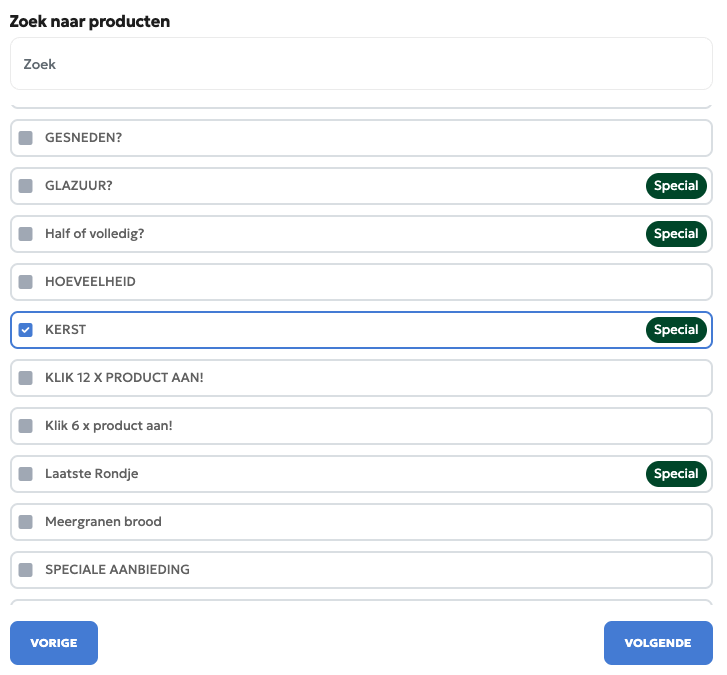 - Selecteer de categorie(en) dat je graag wilt aanbieden in deze special, heb je een product met extra (optionele) keuzes? Duid deze dan zeker ook aan