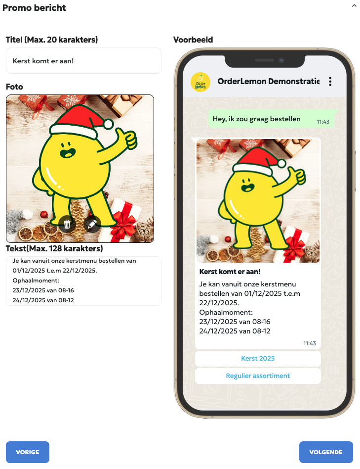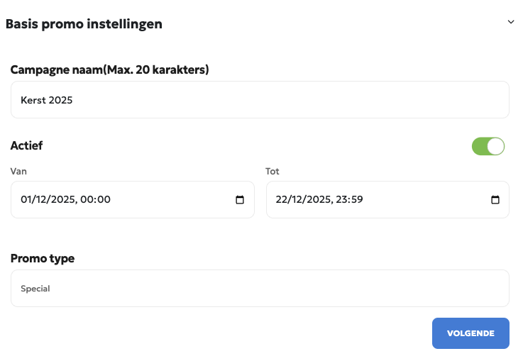 - Voeg een tekst toe, hier kan je een kort promotioneel tekstje plaatsen of informatie weergeven over de looptijd en ophaalmomenten voor jouw special