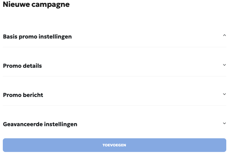 Toont de knop voor jouw campagne niet? Druk dan even op basis promo instellingen en voeg een spatie toe aan de naam van de campagne, je kan deze meteen terug verwijderen.